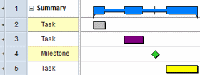 Wanneer u samenvattingstaken toont als subtitels waarvan alleen de naam wordt getoond, worden de taken zelf niet getoond in de balkkaart en de tabel kolommen in de huidige tabel zijn niet gevuld met informatie die verwijst naar de taken, behalve de Naam kolom. Merk op dat de naam van de taken verschijnt, zelfs wanneer de Naam kolom niet wordt getoond in de huidige view.