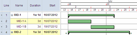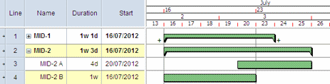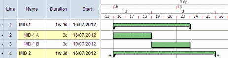 knoppen weergegeven in de Naam kolom in de balken met samenvattingstaken. De eerste samenvattingstaak is dichtgeklapt, en daarom wordt er een