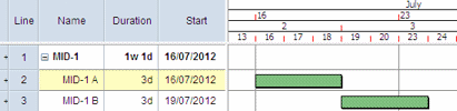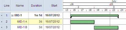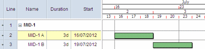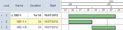 U kunt nu samenvattingstaken 'inknijpen' om de positie van de onderliggende taken binnen de samenvattingsgroepen te tonen. Wanneer u ervoor kiest om samenvattingstaken in te knijpen, verschijnen ze ‘ingedeukt’ op plaatsen waar er geen taken zijn binnen de samenvattingsgroepen , en verschijnen ze in hun normale hoogte daar waar er één of meer taken zijn. Waar zich een mijlpaal bevindt in een samenvattingsgroep , verschijnt er een verticaal lijntje op de samenvattingstaak om haar plaats aan te duiden