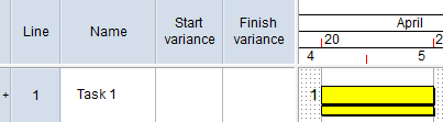 In the following illustration, the finish date of Task 1 differs from the finish date of the corresponding baseline task by 6d. If 5d was the given duration in the settings of this quality metric, Task 1 would fail the metric: