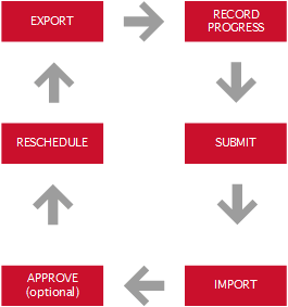 De volgende illustratie toont u de manier waarop Site Progress Mobile gebruikt wordt om de project informatie te updaten met remote-geregistreerde voortgang. Meer informatie over elke fase van het proces wordt onder de illustratie gegeven: